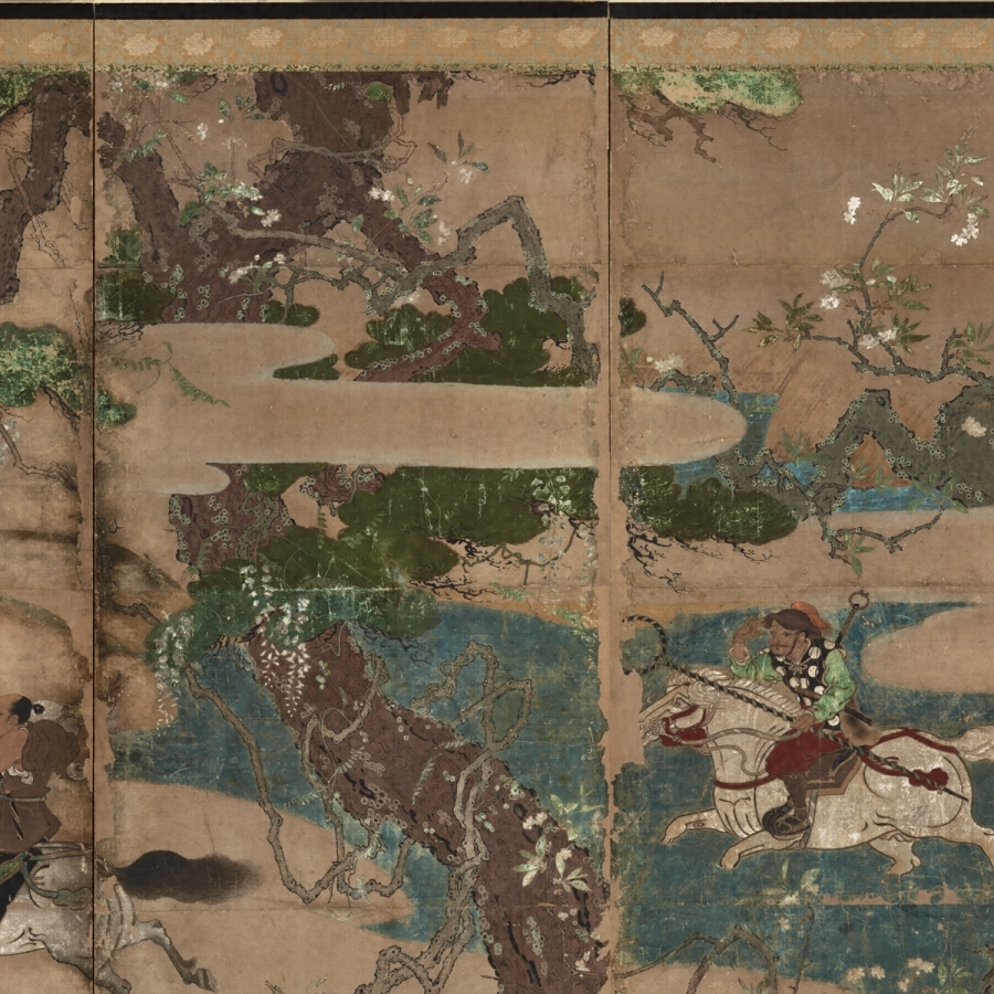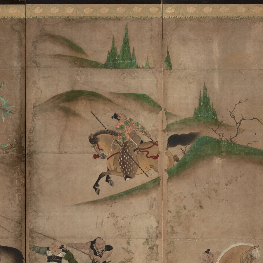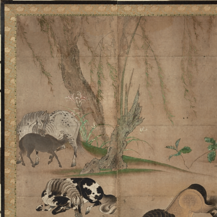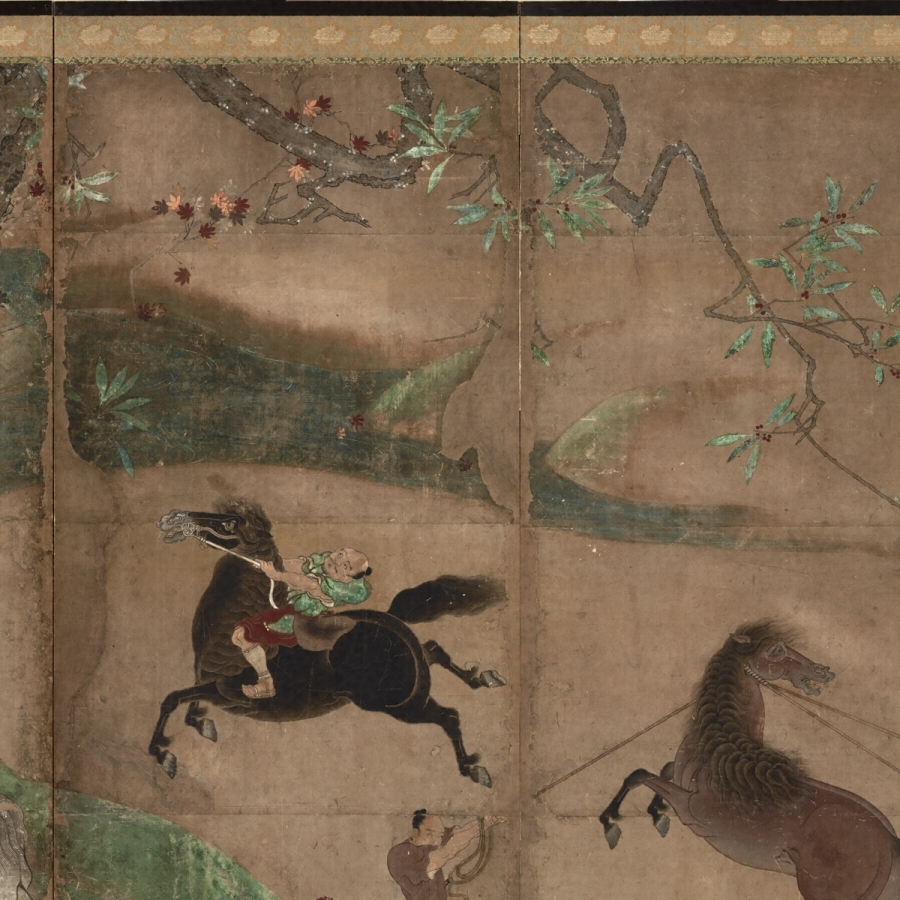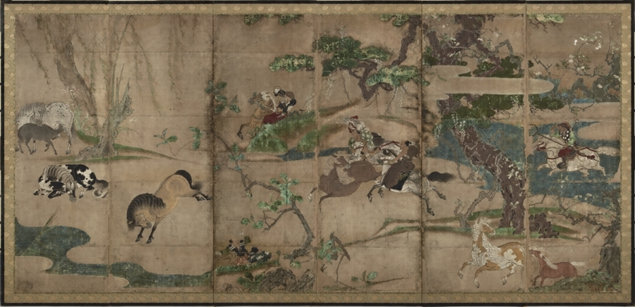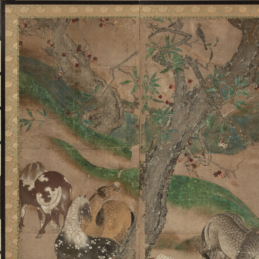 本図の場合は、片ぼかしの土坡【どは】と流水を主体とする未整理な景観描写、景物を画面に充満させるかのような特異な構図感覚、樹木の皴、形態把握等に見る漢画技法の未熟さ、両隻の端に金泥で源氏雲が表されていることなどから、かなり早期の制作である可能性が高いであろう。画題の上で、放牧された馬を広い山野に追いかけ、自在に馬を操る武士の勇壮さをとらえることに関心を示すこと、武士の着衣が華美なものでないことからも、京都より地方の武家の嗜好に応じていると想像され、京都の画壇に本格的にふれる以前の作と推定される。