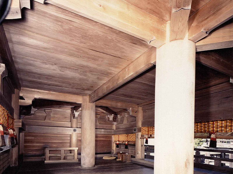 出雲大社は,島根県北東部に鎮座する古社である。境内は,国宝本殿を中心として三重に囲繞する垣によって区画され,本殿周囲には摂末社や宝庫が並び,南面中央東寄りに銅鳥居を配し,その南東には会所がある。
