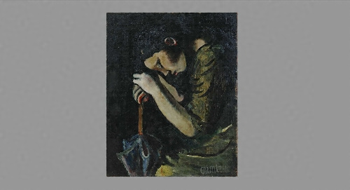 この作品は、二歳年下の妹・コミサを描いた初期の代表作。太く力強い輪郭線や、黒を活かした色調などにルオーの影響が認められます。一方、立体表現や空間の処理には特異な造形感覚を発揮。立体感や存在感を抑えた脚部や右腕の描写が、対照的にふっくらとした左腕や指先、横顔の瑞々しく初々しい表情を強調するようです。