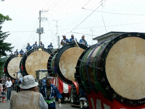 この行事で特に注目されるのは、師匠役・世話役などとも呼ばれる壮年男子によって、太鼓台にのせられた大太鼓・中太鼓・小太鼓の類が笛の音にあわせて各町内を曳かれる点である。うち大太鼓は端面で直径十尺五寸(三・一八メートル)、胴の長さ十二尺(三・六三メートル)、重さ二トンにもおよぶもので、その太鼓打ちの人数は上に前後五人ずつの十人、下で前後二人ずつの四人にもおよび、一筋二十余人の二筋の綱で曳くという大がかりなもので、その音は四里四方になり響くとか、この地方の霊峰田代山神社の神霊にもきこえるとか信じられている。