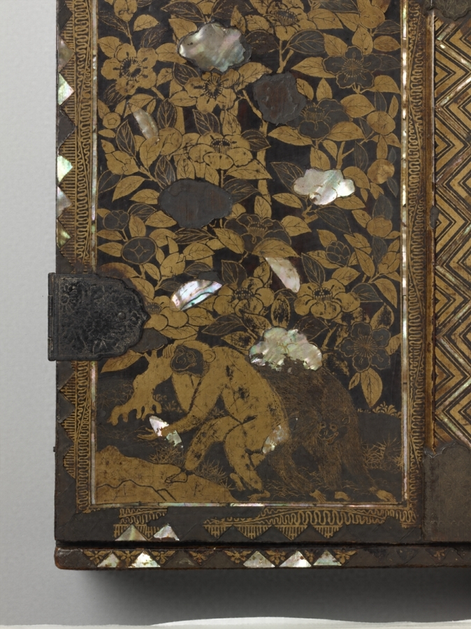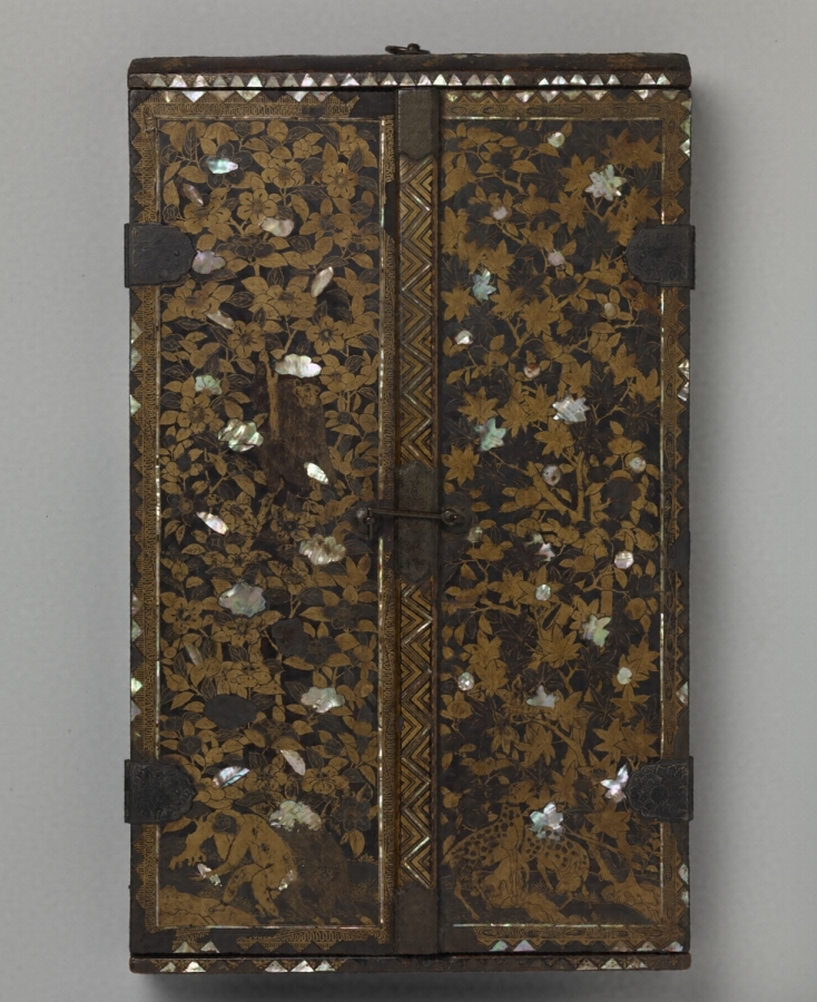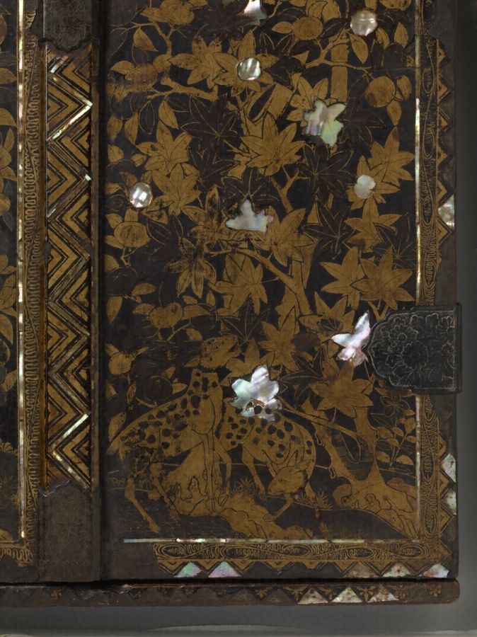 木造、長方形、黒漆塗、両開き観音扉付き、薄い箱状の厨子。上部丸棟、中央に菊座丸鐶の釣り金具を打つ。扉の表裏全面に金銀平蒔絵を施し、針描を交え、ところどころに厚貝螺鈿を併用している。右扉表面は楓・・橘の下部に雌雄二匹の鹿を、その裏面に椿と梟、猿を配し、左扉表面は椿の下方に二匹、樹上に一匹の猿を、その裏面には楓・橘と鹿を図す。扉の周囲は鋸歯文と南蛮唐草文で枠取し、龕側面には葡萄唐草文を装す。背板内部背板は黒漆地に油彩で、キリスト磔刑像が描かれ、その枠には片輪車連続文帯を施す。