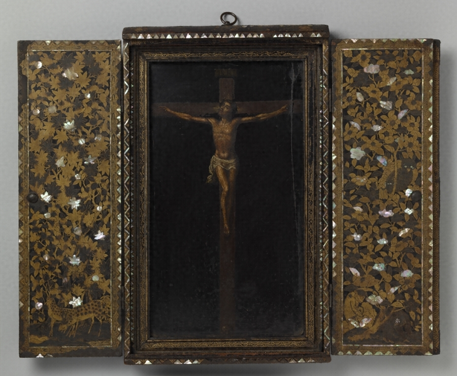 この聖龕は、いわゆる南蛮貿易の一つとして桃山後期頃から京都において作られたものである。外面と扉裏に花樹・鳥・獣を蒔絵と螺鈿であらわし、内にキリスト磔刑像を油絵で描いている。この絵はスペイン南部の画家によってかかれたと推定される。近世初頭における東西交渉を物語る資料であり、いわゆる南蛮漆芸の中でも類例の少ない遺品である。