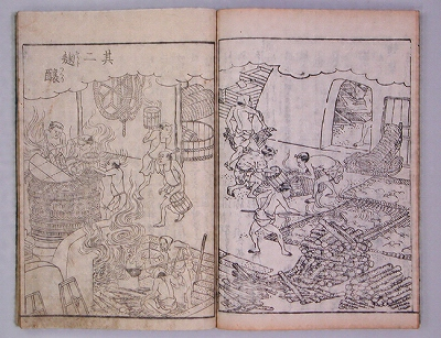 日本各地の産物の採取や生産の様子を図解した本。寛政11年(1799)に初版が出され、以後版を重ねて出版された。本書はその初版本で、1巻に酒造、2巻に石材をはじめとする山地の産物、3・4巻に水産物関係、5巻に伊万里陶器、松前の昆布などの物産、長崎に入港する唐船や阿蘭陀船からの異国の産物などが、詳細な図とともに紹介されている。著者は大坂の酒造家で知識人でも知られた木村兼葭堂、図は『近江名所図会』や『伊勢参宮名所図会』の挿図を描いた蔀関月による。