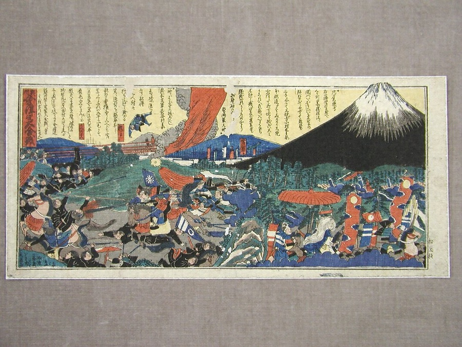 会津戦争の激しい攻防を描いた錦絵。薩摩・長州・土佐・大垣などの藩兵を主力とする新政府軍は、明治元年(1868)8月21日、母成峠を突破し会津若松城下に侵入する。24日、新政府官軍は若松城攻略を開始、一進一退を繰り返すが、アームストロング砲・ライフルカノン砲など50門の大砲で包囲したことにより優勢となった。会津藩主松平容保は約1ヵ月の籠城のすえ9月22日に降伏、新政府軍は会津藩主父子に家名断絶という厳しい処分を申し渡した。その後、旧会津藩士による再興嘆願が実り、明治2年11月、陸奥国下北半島(青森県)に3万石が与えられ斗南藩として再出発する。しかし酷寒と飢えのため死者が続出した。