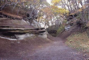 第三紀砂岩層ノ風蝕面ガ波紋ニ肖タル明瞭ナル交叉層(僞層)ヲ呈シ且層中ニ多數ノ介殻破片ヲ藏シテ淺海堆積層タルコトノ標式的特徴ヲ有ス