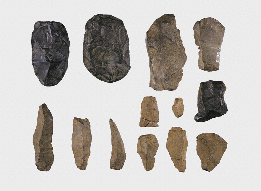 本遺跡は、赤城山の東南方、渡良瀬川右岸地域の小独立丘陵上にあって、丘陵の北部は稲荷山、南部は山寺山及び金比羅山と呼ばれる。稲荷山と山寺山を分ける低い鞍部には町道が通るが、相沢忠洋が始めて石器を発見したのは、昭和21年頃、この道路の切通しにおいてであるといわれており、昭和24年の明治大学の調査では、切通しの北側はA区、南側はB区と命名され、A区において上下2層の石器文化層が確認されたのである。下層の岩宿I文化と呼ばれる石器群は、地表下約1.5メートルの中部ローム最上部の暗色帯中に含まれており、楕円形の石斧2点の他、掻器類・刃器状剥片・石核があって、石材には主に頁岩[けつがん]が用いられている。同層からは多数の自然礫やクリ材の炭化物もみられた。この暗色帯の最上部にはAT火山灰がみとめられ、岩宿I文化の年代は2万年前以前に溯ると考えられる。岩宿II文化は、上部ローム層中に含まれる切出状のナイフ形石器を指標とする文化で、瑪瑙・頁岩・黒耀石・安山岩など多様な石材が用いられている。