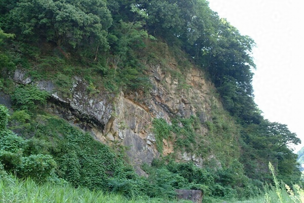 手取統ノ猪ノ谷層(砂岩頁岩ノ互層)ノ地層ガ標式的ナル背斜及向斜ヲナシテ神通川ノ左岸ニ好露出ヲ呈スルモノナリ