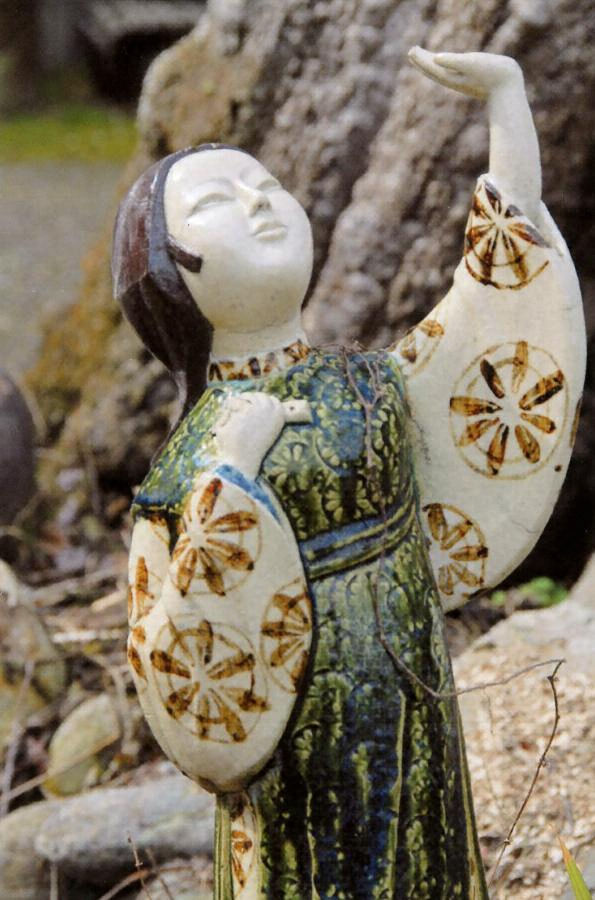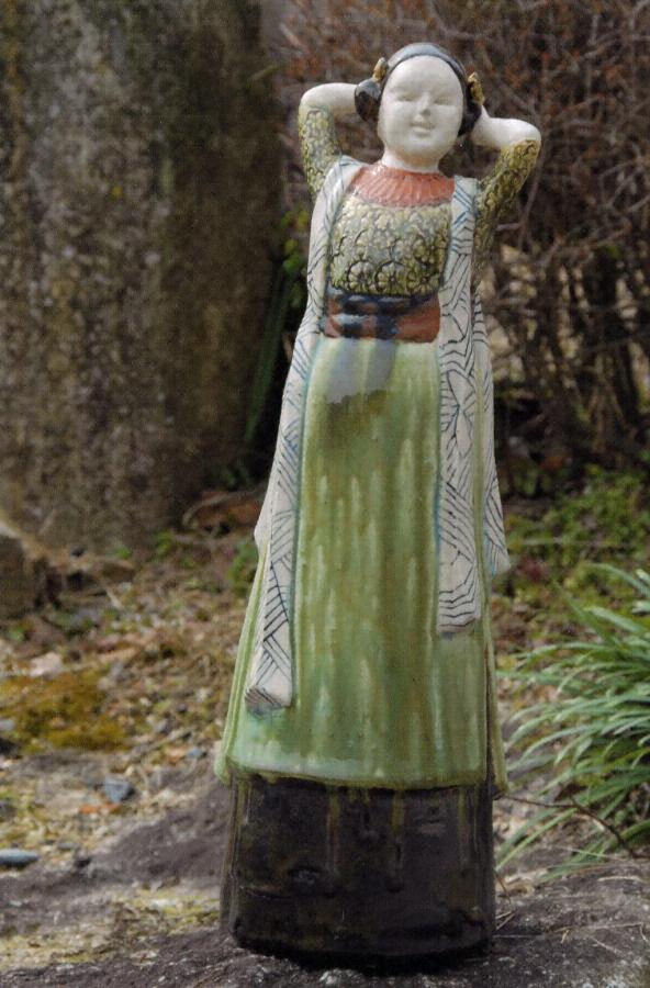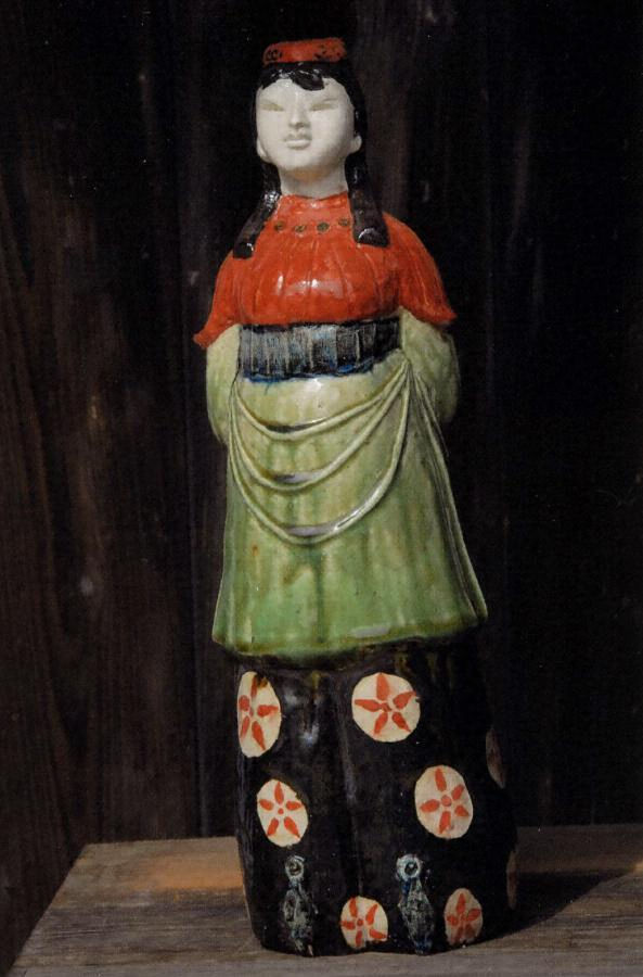 陶人形技術保持者の伊村徳子氏は、大阪府高石市に生まれ、金沢美術工芸大学を卒業後、昭和46年に瑞浪に居を定め、白倉窯を開き創作活動を続けています。氏の陶人形は、日本古来の陶人形に、美濃焼の伝統的加飾技法である織部釉、長石釉、錆化粧等の技法を加え制作されることに特色があります。日本現代陶彫展での大賞受賞をはじめ日本陶芸展や女流陶芸展等で入賞するなど、その技量は高く評価されています。