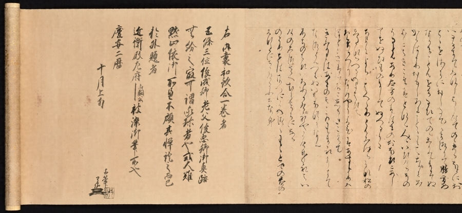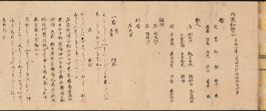 村上天皇の天徳四年(九六〇)三月内裏清凉殿で行われた歌合で、二十巻本歌合の第一巻(内裏)に収められていたものである。本文料紙は斐交り楮紙に天地横罫を施し、本文は首に「内裏和歌合〈天徳四年三月卅日於清凉殿有此事/〉」と内題を掲げ、ついで題、歌人、講師、判者を記して、歌合は二十番を合せる。本文の筆跡は二十巻本歌合のうち第一種、いわゆる伝俊忠筆二條切に属するもので、平安時代後期の代表的仮名書風を伝え、書道史上の遺品としても珍重されている。