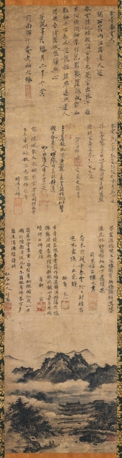 最上部に「古寺春雲為関西蒋山温崗老人題」と題した竹庵大縁の七言律詩があり、二段目に景南英文、与可心交、伯元清禅、三段目に古標大秀、江西龍派、亀軒一誠、信中明篤ら著名な五山僧たちの賛が整然と書かれた詩画軸である。関西蒋山はおそらく豊後の万寿寺のことと考えられ、同寺の温崗老人(不詳)のために諸僧が集まって制作したもので、竹庵大縁はその時を永享三年(一四三一)十二月二十七日と記している。