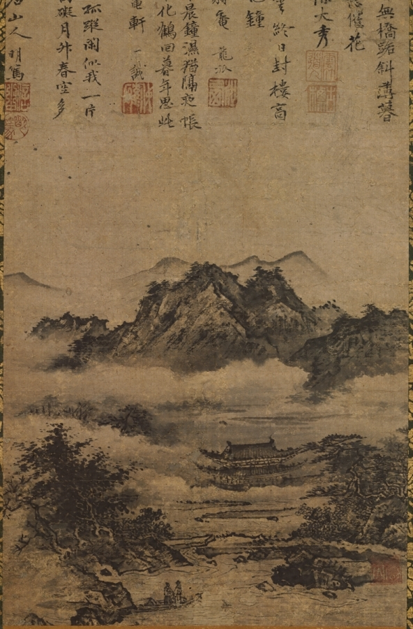山水の様相を述べると、遠山はほぼ水平に横たわり、その前に遠山とほぼ同じ高さに主山が粗い地肌を見せながら横に広がる。その下方は一部滲みを見せる雲によって覆われる。主峰の直下より発した河水は蛇行しながら手前に流れ、左右より土坡が入りくみ、その一つに重層の伽藍が建つが下部は雲に埋れる。近景は左右より岩が流れを扼するようにせり出し、もっとも狭いところに石橋がかかる。岩の両側には濃く樹影が重なる。