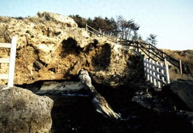 山陰線久手驛ニ近キ海岸ニ露出ス。第三紀ノ木化石ガ火山泥流ノ固結シタルト覺シキ角礫凝灰岩中ニ埋藏セラルヽモノニシテ中ニハ木質ノ炭化シタルモノアレド多クハ硅化シテ硅化木トナレリ、樹種ハ概ネ濶葉樹ニ屬セリソノ成因ガ火山破裂ニ関係セル點ガ北九州等ニ多ク見出サルヽ硅化木ト異リテ學問上珍シキモノナリ