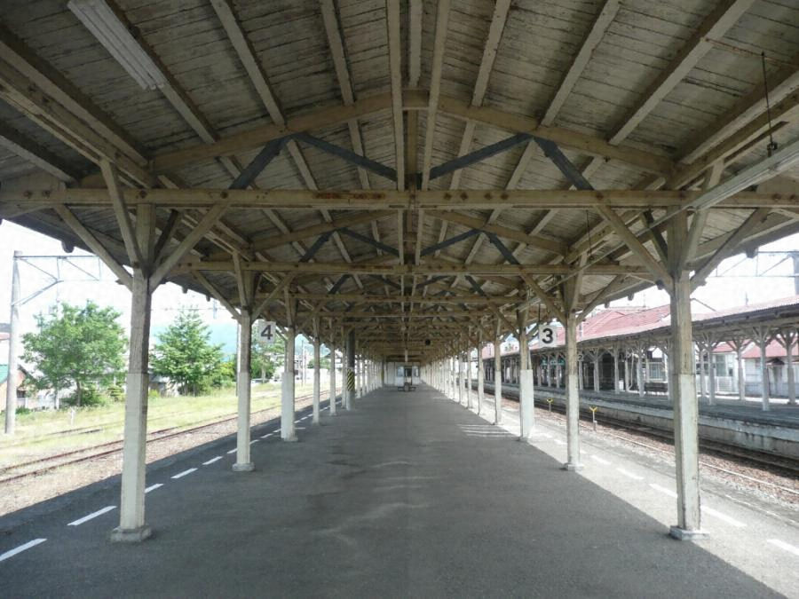 本屋の東側に対面する島式プラットホーム。南北に延びるプラットホーム上に桁行一二七・四メートル梁間五・五メートルの上屋を建てる。木造、切妻造スレート葺、小屋組は挟み梁の変形トラスとする。開業当初は県内最大規模を誇った長大な旅客上屋。