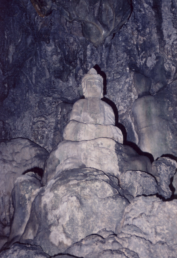 古生層ノ石灰岩ヨリ成レル根笠台地ニアル石灰洞窟ナリ洞窟ハ奥行約十三メートル幅約六メートル高約十一メートル規模大ナラズト雖鍾乳石及石筍ハ頗ル能ク發達シ殊ニ洞内ノ略中央ニ石灰華ヨリ成レル高約〇.八五メートルノ座像アリ是レ石灰華ガ木像ノ観音ヲ被フテ発達シ後木質腐朽シテ観音像ノ假像ヲナスニ至リタルモノニシテ學術上珍トスルニ足ル