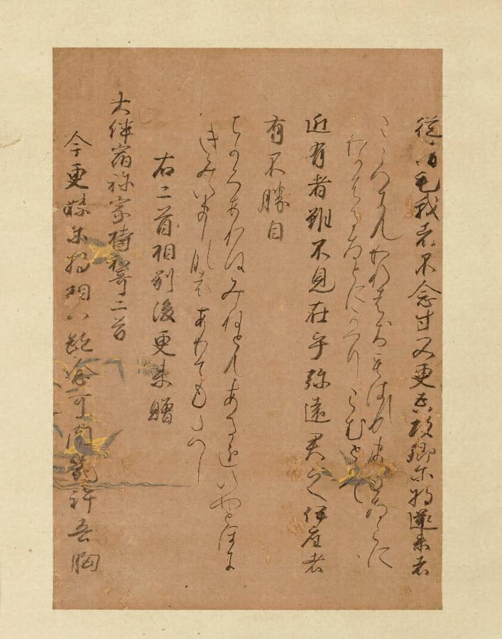 本作品は「栂尾切」と呼ばれる古筆切で、『万葉集』伝本の最古写本『桂本万葉集』巻四(三の丸尚蔵館蔵)の断簡である。伝称筆者は源順(911~983)とされている。料紙には、茶染紙に金銀泥にて草花・鳥・流水の下絵を施した装飾料紙を用いる。華麗な装飾料紙と、漢字・仮名とも優麗典雅にして気品の高い書風は、王朝貴族の美意識を反映しており、「栂尾切」は古筆切の名品とされてきた。