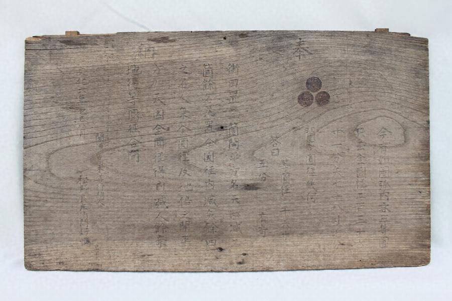 この算額は本県で三番目に古いとされ、図形の内外接に関 する問題としては一番程度の高いものである。「高木善行」は江戸の鯖江藩士に和算を教えた人物 で、鯖江藩の和算発展に大きな貢献をした。事実、市内には 数多くの算額が奉納されており、その多くが高度な知識を要 求する問題であることからもうかがえる。問題は、天=√3、地=2-√3、人=4(全円径-矢)と置けば、三等円の直径は、条件より、三等円の直径={√2(人・全円径・地)+天・全円径―人}・地と表すことができる。術文は、この式を漢文で書き記したものである。