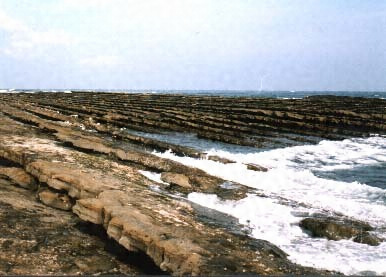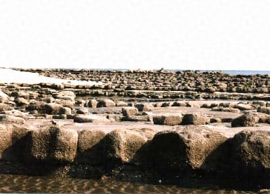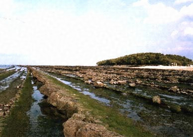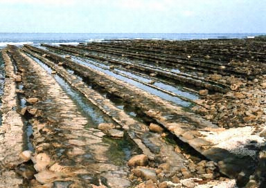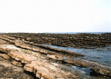 青島ノ周囲及其ノ對岸ナル戸崎鼻ヨリ南ノ方巾着島ニ至ル間ノ海岸ニアリ千潮時ニハ幅二十メートルヨリ百メートルニ亘リテ平坦ナル波蝕海床ヲ水面上ニ露出ス コノ波蝕海床ハ第三紀ノ砂岩及頁岩ノ密ナル互層ヨリ成リ全層東南ニ緩斜セル單斜構造ヲナシテ曽テ浅海ノ下ニ波蝕海棚ヲナセシモノナルガ過去ノ大地震ニ際シテ突然隆起シ其一部が水面上ニ露ハルルニ至リタルモノナリ水成岩ノ水平的自然断面トシテモ最モ標式的ニシテ且美麗ナルモノトス