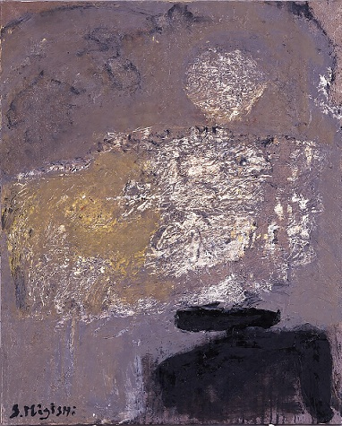 「花の作品が三岸節子を支えている」と自身が語るほど、作者にとって花の絵は70年以上に及ぶ画業において欠くべからざるモチーフであった。本作品では、華やかな色彩に溢れた瑞々しい花ではなく、すでに枯れて淡いグレーに消え入りそうになりながらも白と黄色をわずかに残す花を描いている。表面的な美しさや若々しさはなくとも、花としての存在や余分なものを除いた後にもわずかに内在する美や気品といったものすら感じさせる。80歳を過ぎてなお、花の多様な美しさを描き続ける作者の、精神的な肖像画ともいえる作品であろう。