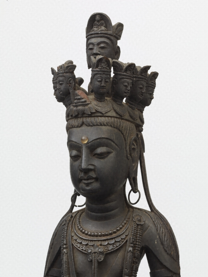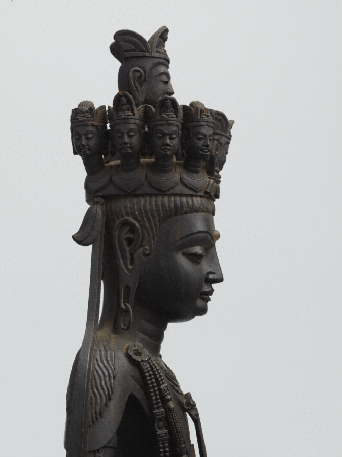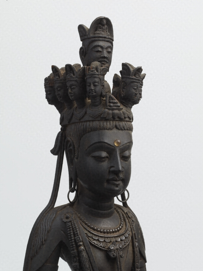頭上面から化仏、瓔珞、天衣の大部分、足〓に至るまでの全容を白檀と推定される一材から彫出する。表面を薄く褐色に染めるという典型的な檀像彫刻で、現状、頂上面が後補にかわっているものの像高一尺三寸七分を測り、法量、用材等からみて十一面神呪経に説く「白栴檀、一磔(〓)手半(一尺三寸)」に従っての造像とみなされる。