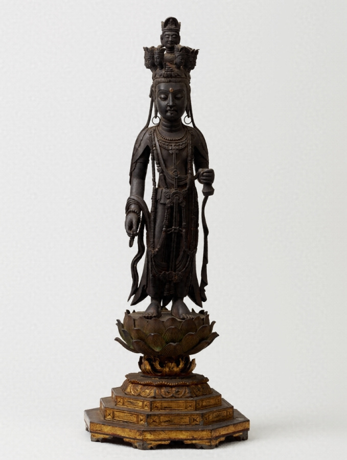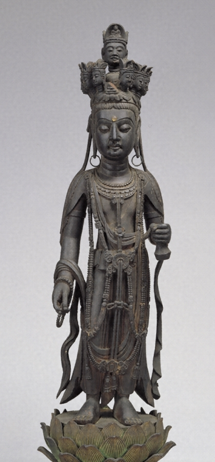頭部の地髪部上半に鉢状の被物をつけ、被物上に九面(現状、菩薩面二、瞋怒面一、牙上出面五〈面相は慈悲相〉。背面一面欠失。)および正面に化仏坐像(拱手)を配す。正面を向き、左手は屈臂して水瓶を執り、右手は肘を軽く曲げて垂下させ、掌を内に向け、数珠を手首に掛け、第一・二指で数珠をつまみ、腰をわずかに左に捻り、右膝を軽く曲げ前に出して立つ。著衣は、僧祇支、裙、天衣を各着ける。
