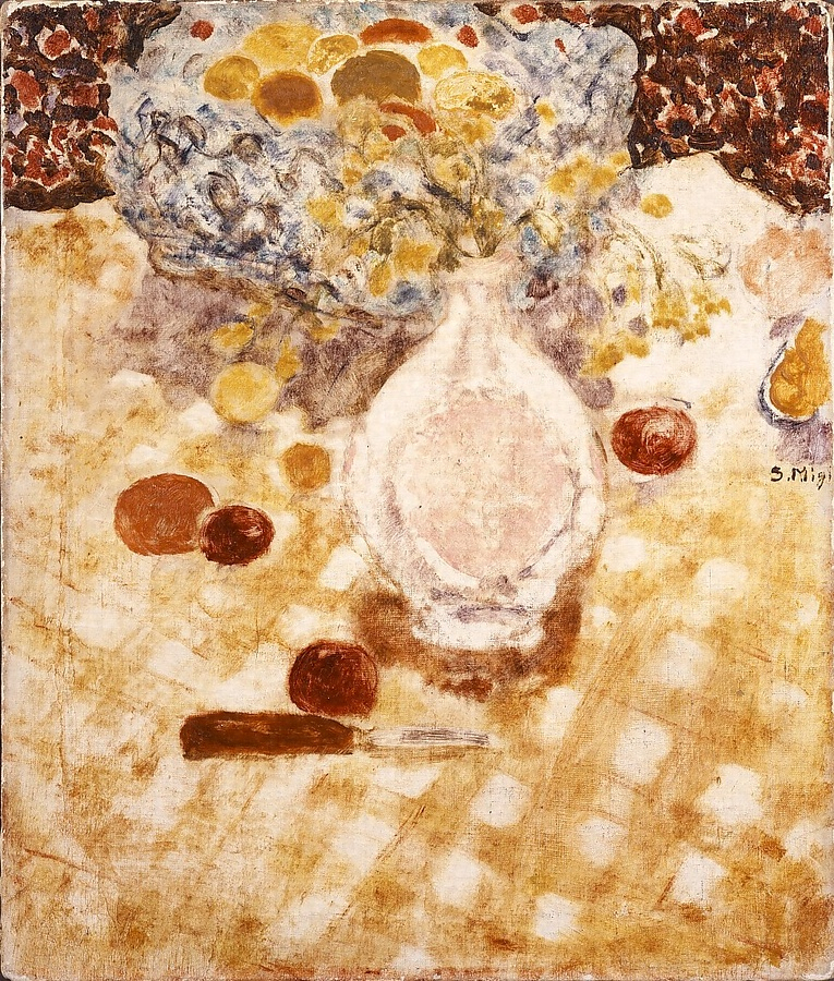 作者の視線はテーブルに近づき、この作品ではテーブルクロスは画面とほとんど平行になる程せり上がっている。テーブルの上に果物や花瓶が赤紫の影とともに浮かび上がっているが、中央の花瓶はぼんやりとした形体で、むしろ奥にある果物や背景が濃い色彩ではっきりと描き出されている。そして点描により描かれていることも相まって、画面は収束点を持たずオールオーバーなものとなり、鑑賞者の視線は手前から点々と配されたナイフや果物をたどりながら画面上をさまよい、さらに格子柄のテーブルクロスや右端に半分だけ見える果物と共にキャンバスの外へと広がる。視線が動くことでものを見る角度も変わり、手前では上部から見ている視点も、奥へと行くほど低い位置からの視点へと変わっている。このような視線の移動と結びついた画面構成の方法は、フランスの親密派の画家ボナールの作品等から学び取ったものであろう。