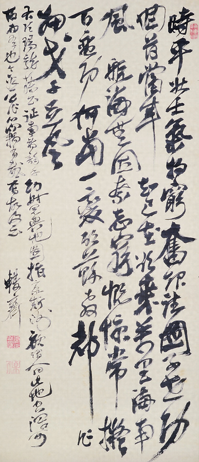 10代佐賀藩主・鍋島直正(1814~71/号 閑叟)が、 嘉永~安政年間頃に書した作品。一行目「奮」字の右払いなど全体的に鋭い筆跡が目につく。スピード感のある止め・ハネなど呵成に書き付けた感が強い。この 詩は、仙台藩主伊達政宗が慶長遣欧使節に関して詠んだ詩を見て感じるところのあった直正が、「豪斯洲」すなわちオーストラリア進出を構想して嘉永4年 (1851)に詠んだもの(直正漢詩集「野人亭稿」に収録)。本作品の書風は、直正の代表的な書として「先憂後楽」の呼び名で知られる安政3年 (1856)の「范仲淹・岳陽楼記句」(佐賀県立博物館・美術館所蔵)に近い。このことから、嘉永4年以降さほど遠からぬ時期の作品と見られる。
