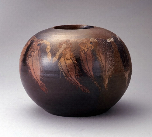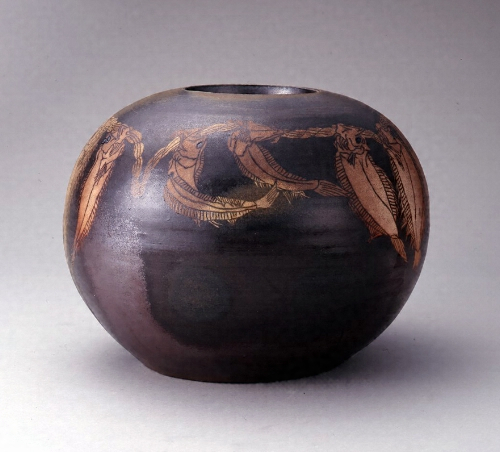 壺をぐるりと囲むように表現されているのは、尾道の名産品“でべら”。えらの部分から荒縄を通し、11月〜2月頃の冷たい潮風にあてて作られるタマガンゾウビラメの干物です。でべらを干す風景は、冬の瀬戸内を代表する景色でもあります。作者は、うつわ本体とは異なる、色土をはめこんで文様を表現する象嵌という技法を得意としています。なかでも「面象嵌」と呼ばれる、大きな文様を施す表現は、技術的に大変難しく、作者が長年をかけて実現させたものです。