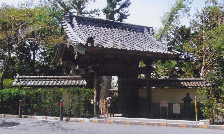 本館の北方、東側道路に面して建つ間口三・二メートルの四脚門で、切妻造桟瓦葺である。円柱の本柱間を冠木で繋いで絵様虹梁を重ね、控柱は頭貫と台輪で固める。皿斗付大斗の三斗を詰組とし、軒は二軒繁垂木、妻飾は虹梁蟇股である。禅宗様意匠を取入れた四脚門。