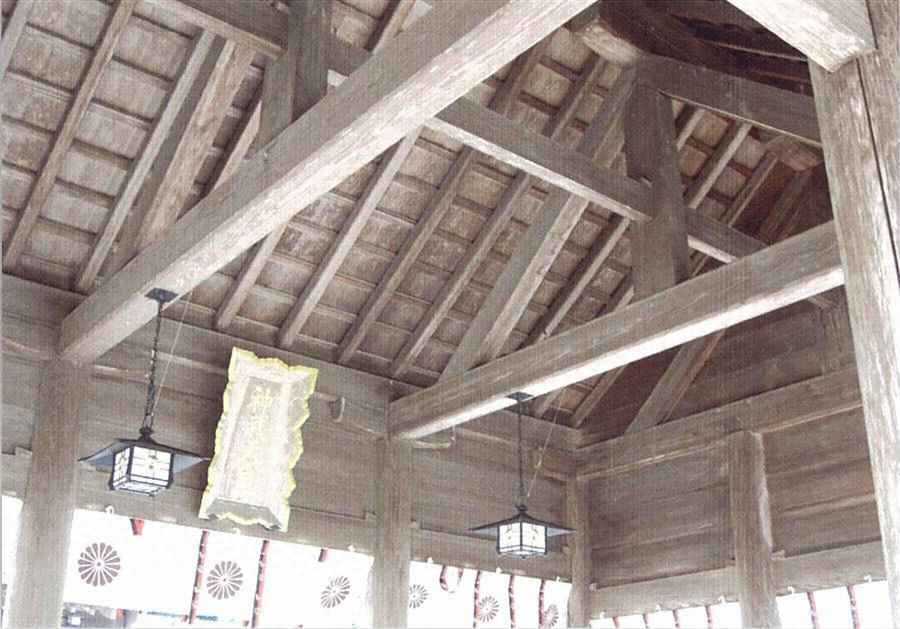 幣殿の南方、正門との中程に位置する。桁行三間梁間三間、切妻造銅板葺。礎石上に円柱を建て、内法貫で固め、舟肘木を置き、桁や梁を支持。小壁を板壁とし、一軒疎垂木。四方吹放ちで、石敷、化粧屋根裏とし、各梁間に豕叉首を組む。大規模で、開放的な拝所。