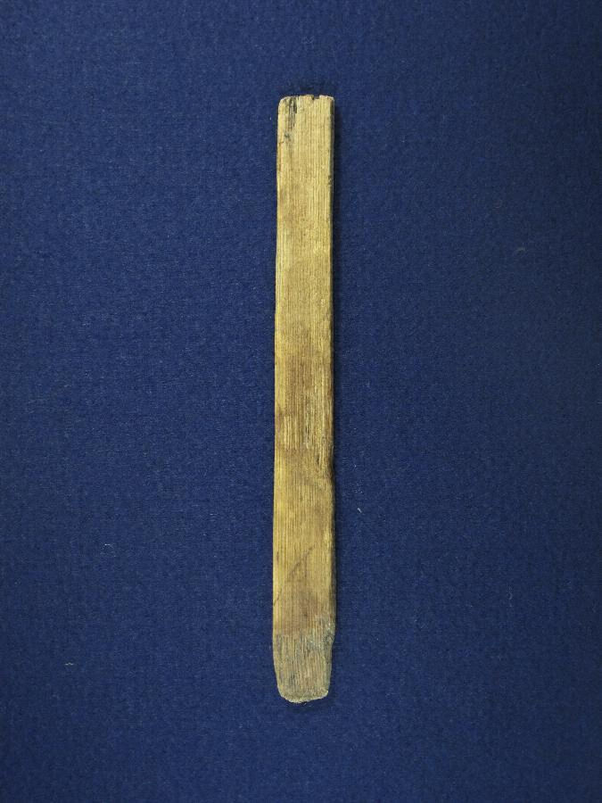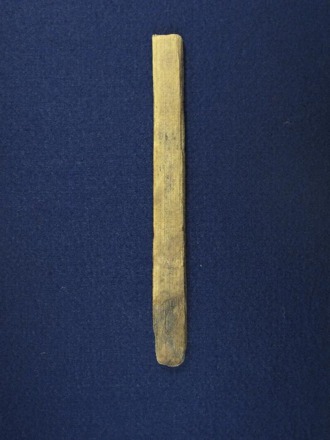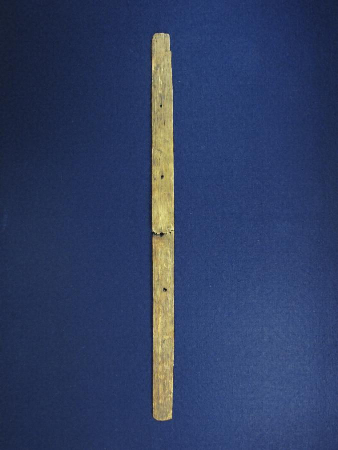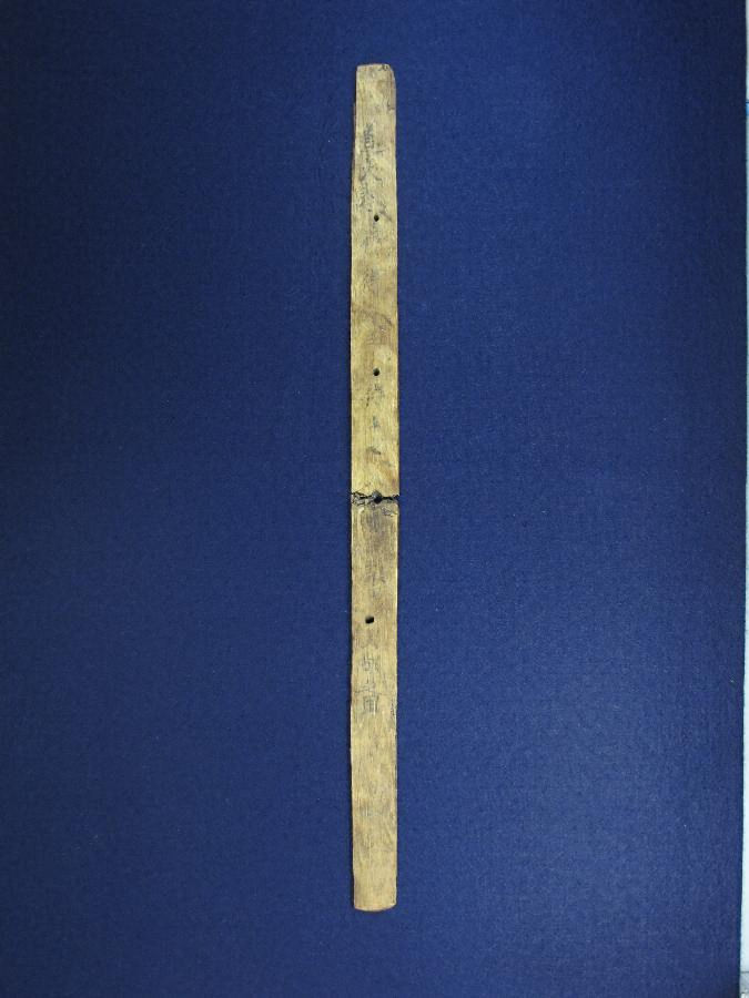 ①は判読不能だが、片面に6~7文字書かれていると推定される。②は折り切られた状態出土し、等間隔に直径0.4cm の孔が貫通している。両面に文字が書かれており、いわゆる習書木簡である。「呉部足国」は人名で、「呉部」という氏族は渡来系氏族と考えられている。「呉部足国」は三河地域の古代氏族と考えて差し支えなく、人名が解読できる木簡としては県内初例である。古代木簡の出土は愛知県内においても極めて少なく、三河においては市内下懸遺跡出土木簡1点に次ぐ2例目となる。