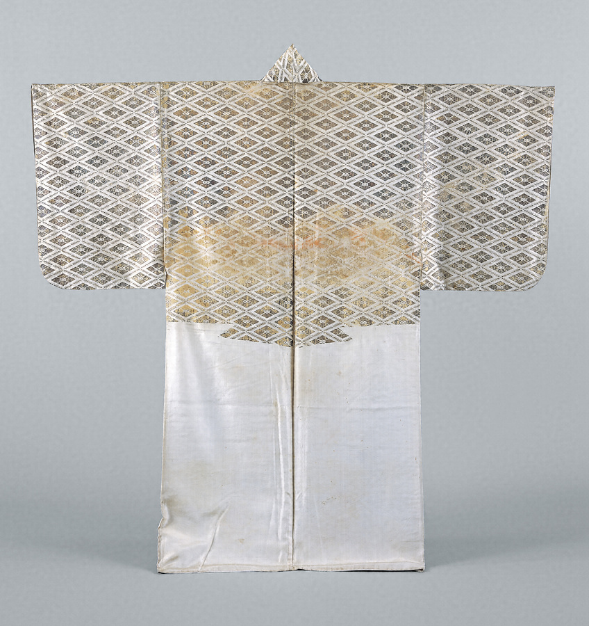 白平絹の腰から上を松皮菱のように金箔で幸菱繋ぎとして摺り表した摺箔である。摺箔は着付として使用するため、時代が下るに従い腰から下に模様を配置しなくなる。本品もそうした時代背景をもった一領である。