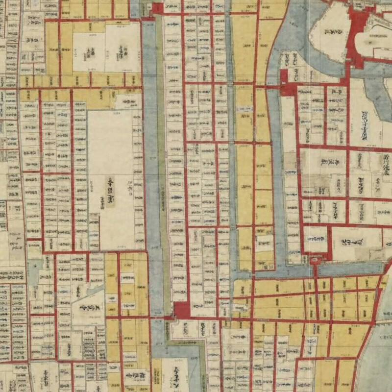 岡山城下町を描いた4枚1組の絵図のうちの1枚。宝永年間(1704~11)に作成されたと考えられている。備前国岡山城下図(川西北)で円乗院があった場所が学校になっている。しかし、学校奉行の屋敷があった北部の敷地は削減されて池田主殿の屋敷地とされたことが、貼り紙で示されている。