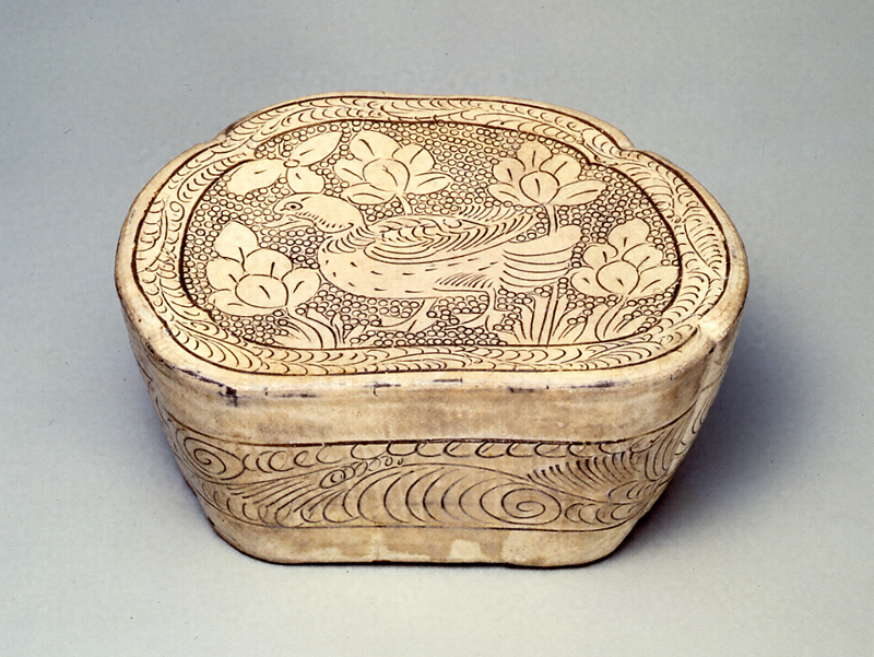 白釉は、灰色の素地に白土を塗り、透明釉をかけた焼物。産地としては中国河北省の磁州窯が有名だが、この枕はその系統をくむ河南省の作と思われる。水辺の鳥と蓮花を線彫りで表し、地の部分は金工の魚子を思わせる細かな珠文で埋め尽くす。やや小振りながら達者な文様の線が魅力である。