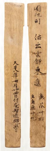 菜園や池を管理する園池(えんち)司の官人の出雲鎌束が、熟瓜(ほぞち)とササゲを藤原麻呂邸に進上する木簡。佑(じょう)は第三等官(但し、司には次官のポストがない)。この木簡を実際に書いたのは、日付の下に名まえの書かれた奄智(あむち)造縄麻呂である。天平八年は736年。