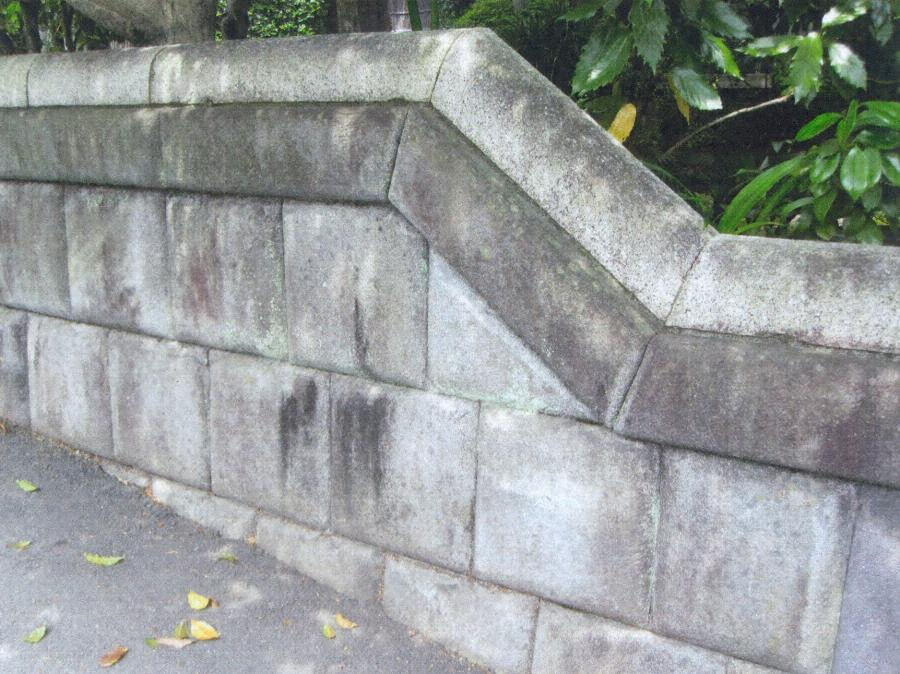 敷地南面の入口中央東寄りに門柱一対を立て、左右に石垣をのばす。門柱は花崗岩製で瘤出し仕上げに丸面取を施す。石垣は見付を方形とした切石を高さ一~二メートルに布積し、頂部に蒲鉾形の笠石を伏せる。積石も丸面を取り、重厚ながら柔和な印象をつくる。