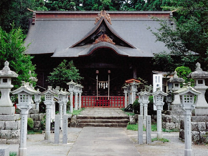 境内の南面に随身門を開き、中央に本殿、幣殿、拝殿を建て、その周囲に複数の摂社と末社を配置する。本殿、幣殿、拝殿は権現造の形式で、彫刻や塗装で内外を豊かに装飾する。とくに本殿は、柱間(はしらま)を6尺に統一し、同一下絵による彫刻を多用して濃密に仕上げる。
