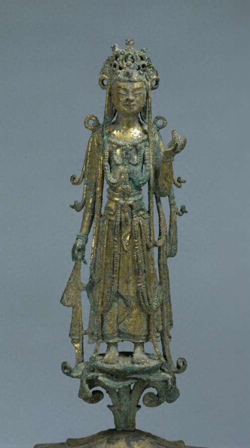 もと阿弥陀三尊の両脇侍であったと考えられる観音・勢至の二菩薩像で、それぞれ本体は蓮華座及び蓮茎を含めて一鋳とする。球形に近い頭部に初々しい童貌を表し、細身の体躯は簡潔な象形で、稀にみる瀟洒な全体観をみせる。また細い手指の造りや天衣・瓔珞【ようらく】等、宝冠や光背の透彫の精緻な彫技と共に鏤刻の粋を示す。隋代金銅仏の一傾向を示すばかりでなく中国金銅仏の中で繊細華麗な面を代表する作品として注目される。