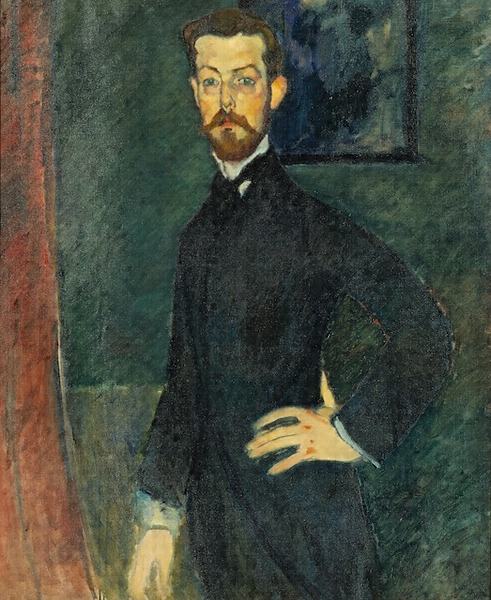 イタリアのリヴォルノに生まれたモディリアーニは、1906年1月、絵を描くためにパリに出た。その翌年の11月、本作のモデルとなっている人物───医師で美術愛好家のポール・アレクサンドル博士と知り合う。モディリアーニの作品に関心をもった最初の人である。彼は1914年に第一次世界大戦に出征を余儀なくされるまで、モディリアーニのパトロンであり、この若い画家を激励し、その作品を買い続けた。フランス人で知識豊かな美術愛好家であったポール・アレクサンドルは、無名の芸術家を公衆、画商、収集家に紹介するチャンスのある公的機関にもよく通じており、さまざまな面でモディリアーニを支援し、その芸術活動を支えた。1908年になると、モディリアーニはポール博士とその弟ジャンが創設した芸術家コロニーにしばしば通うようになる。1909年には同博士の3点の肖像画が描かれたが、その中では本作が最も完成度が高く、素晴らしい出来映えを示している。同年に描かれた《乗馬服の女》(ニューヨーク、個人蔵)と同じように、左手を腰にあてたポーズの4分の3分身像となっている。この博士の肖像画シリーズは、ある意味では「芸術のパトロンが画家へ出資することによって彼の肖像画が描かれる」というルネサンス以来のイタリア絵画の伝統を思い起こさせる。ちょうどこの絵が描かれた頃、モディリアーニは彫刻家コンスタンティン・ブランクーシと友情を結び、以後の数年間は彫刻に没頭することになる。しかし絵画を放棄したわけではなく、1914年以降の細長く平面的にデフォルメされたいわゆるモディリアーニ様式に繋がってゆく。本作は若いモディリアーニの瑞々しい感覚が漂う初期の秀作といえよう。