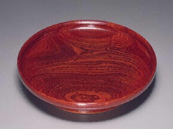 本作品は、製材した後約20年間乾燥させた欅材を素材とし、挽物技法で制作した高台付きの盛器。高台には金線象嵌を廻らす。口縁部に朱漆の摺漆を2回施し、中心から口縁部にかけては生漆の拭漆を重ねて仕上げている。大振りの簡素な形態で、口縁部もやや厚めの力強い造形の作品である。