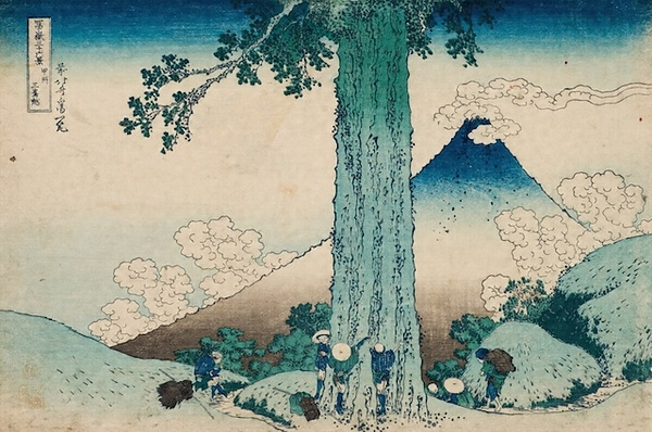 「三島越」とは甲州から籠坂峠を越え御殿場を通り三島へ抜ける道をいったものである。画中の巨木の太いこと太いこと!その巨木と背景の富士との対比も大胆であるが、巨木に驚嘆した旅人が童心に帰り、手をつないで大きさをはかろうとするしぐさがいかにも人間らしい。画中に漂う雲の形までユニークな空気を醸し出している。