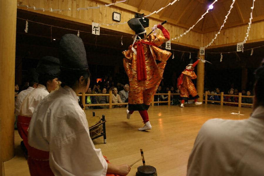「神下【かみおろし】」以下「磐戸開【いわとびらき】」に至るまで三十三座の曲目を有するが、御幣、榊、鈴、弓、剣等の採り物の舞(素面)あり、記紀の神話を素材した演劇風の舞(おもに仮面をつける)がある。荒神が高い竹竿(十メートル余の青竹)を昇る蛛蜘舞風の曲芸を見せる「天王注連【てんのうしめ】」の舞を持つなど地方的特色を見せる神楽である。