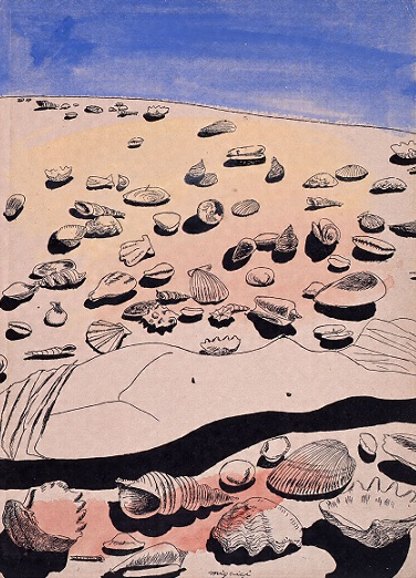 このイメージは、第4回独立展に出品された同名の油彩画(100号/福岡市美術館蔵)とほぼ同じ構図であるが、より多くの貝殻が描き込まれている。また、油彩画では空と砂浜にはさまれて海面がわずかに望めるが、ここでは海を示す線は描かれていない。