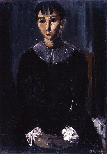 近所の娘さんをモデルに描いたといわれる。モデルとはいっても、それに似せた写実描写ではなく、三岸好太郎の多くの女性像と同様、その印象から得たイメージが強調される。この作品でも、やや愁いを帯びた表情で静かに物思う雰囲気が伝わってくる。ひだのある白い襟と袖飾りは、同時期に多く描いた道化の衣裳とも通じるものである。