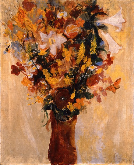1880年に開拓使によって西洋式ホテルとして建設された豊平館(当初北1条西1丁目、現在は約1.5km南西の中島公園内に移設。明治期北海道の洋風建築の代表例として重要文化財に指定されている)は、大正後期からは札幌市の公会堂として利用されていた。ここを会場として三岸は旧作も含めて20点の作品を展示し、札幌市長や商工会議所会頭ら郷里の名士を後援者に連ねて40頁の目録も作った。シャンデリアの下がる瀟洒な会場で得意げにくつろぐ三岸の写真が残されている。その写真の中にも写るこの「花ト蝶」は、その後北海道大学に所蔵されていたが、学園紛争の最中の1969年、バリケード封鎖された校内での損傷を危惧した学生の手によって学外に運び出され、当時の北海道立美術館に預けられ、後に北海道大学から美術館に寄贈された経緯を持つ。黄色を背景に華麗な花束を配した作品は他にも数点残っているが、蝶が描かれているのはこの作品だけである。最晩年に繰り広げた蝶と貝殻シリーズの先駆けともいえるものであり、筆彩素描集『蝶と貝殻』の中の1点にも、同様の構図が現れる。
