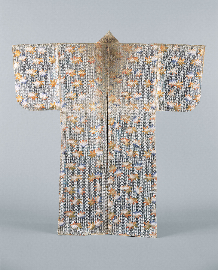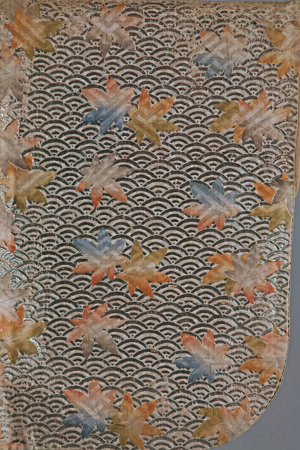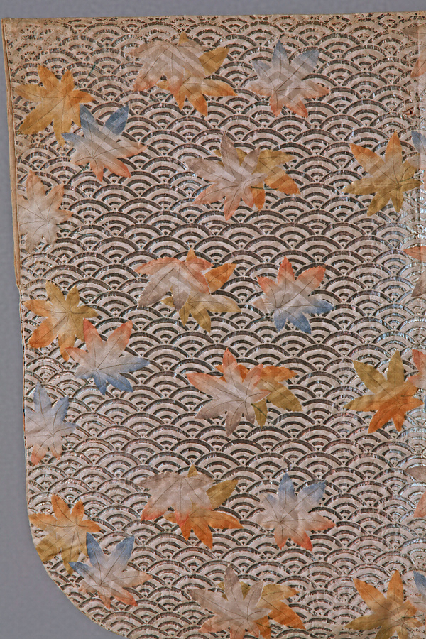 類品に「白地青海波に紅葉文縫箔」(徳川美術館蔵)があるが、腰から上の紅葉の半数ほどを金の摺箔や、色鮮やかな絵緯で刺繍しているところが異なる。