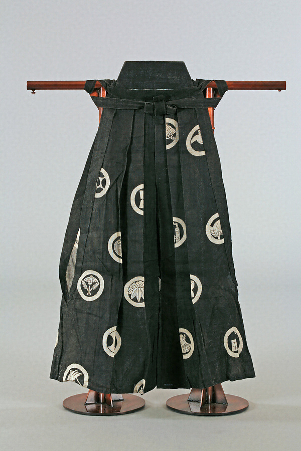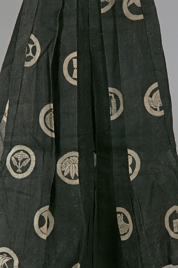 黒地に「狂言紋」とも呼ばれる様々な丸文を散した麻の半袴である。丸文は「二つ杵」「笠」「鍵」「桃」「雪笹」「三つ傘」「臼」「貝」「分銅」「帆」「舵」「千鳥」「手焙」などの吉祥の意匠が選ばれている。腰板には紋がない。