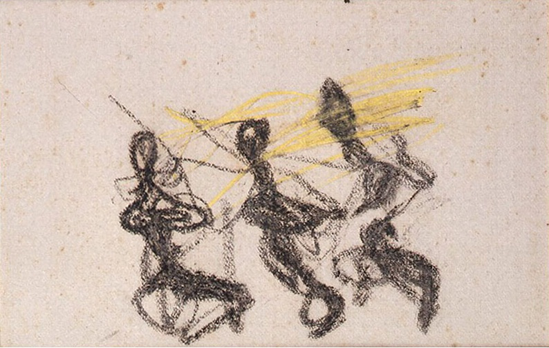 三岸好太郎は1933(昭和8)年、オーケストラの演奏風景を描いた一連の作品を制作した(当館蔵の50号[O-59]、宮城県美術館蔵の50号、焼失した〈新交響楽団〉100号ほか)。それらの油彩画の制作のための準備素描が数多く残されている。そこでは各楽器の演奏者ごとの描写や、指揮者の複数のポーズを描き込んだり、手の動きの軌跡を線で示すなど、演奏の動的な情景を表現するためのシミュレーションも行われている。また、指揮者を正面からとらえたものや、最後列のコントラバス奏者を後ろから描いたものもみられ、三岸が客席から見た情景ばかりでなく、舞台裏にまで入ってデッサンしていたことが推測できる。コントラバス奏者が支えに使用した三角の台(通称ヤマ台)や、簡略ながら描き込まれた天井などがみられるものもあり、日比谷公会堂の特徴を示すという。こうした素描は、鉛筆による簡略なスケッチ的なものから、コンテやクレヨンを用いてのもの(当館蔵D-13~21など)まで、様々な段階のものがみられる。〈ひっかき〉の手法を駆使した油彩画〈オーケストラ〉は、一見即興風にも見えるが、その制作にむけては、三岸が現場やアトリエで入念な準備を行っていたことがうかがわれる。