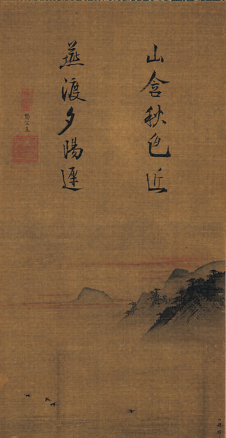 はるかに望む遠山は夕陽の余光をまとっている。手前は湖水で、かすかに波打つ水面近くを4羽の燕が飛んでいる。筆者の馬麟は画院画家を輩出した馬氏一族、なかでも高名な馬遠(ばえん)の子で、自らも寧宗(ねいそう)と理宗に仕えた。対角線にもとづく簡潔な構図、慎重かつ的確な筆遣いは、馬遠派山水画の典型ともいうべきものである。賛に添えられた款印により、本作品は宝祐2年(1254)、理宗が娘である周漢国公主に贈ったものであるとわかる。賛と画は別絹で、もとは対題形式であったものが、わが国に将来されて後、書院を飾る一幅として改装されたと考えられる。