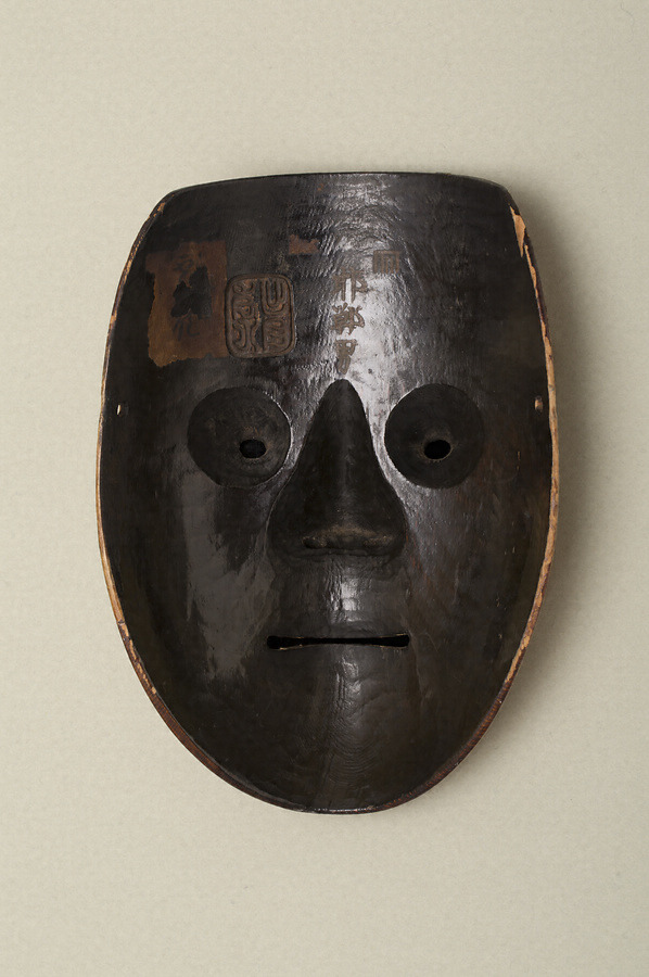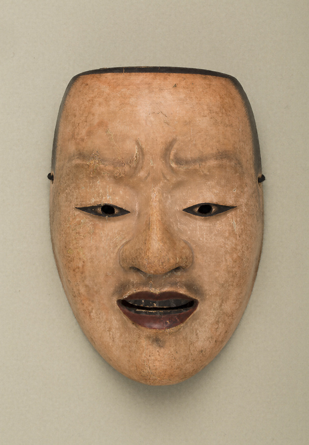 「邯鄲男」は眉根を寄せ、人生に懊悩する哲学青年「盧生」の面差しを表す。汚れや補彩に覆われ痛々しいが、全体の造形は引き締まり、凛々しさが強く伝わる。厚い唇、しかと見据える眼差しに、意志の強さが漲る。裏は、刀目を少なくほぼ平らに仕上げ、黒褐色の漆を施す。「出目友水」の焼印を捺し、金蒔絵で源氏香文「東屋」が表され、「邯鄲男」と記される。同様の作例から、南部家伝来の面と考えられている。