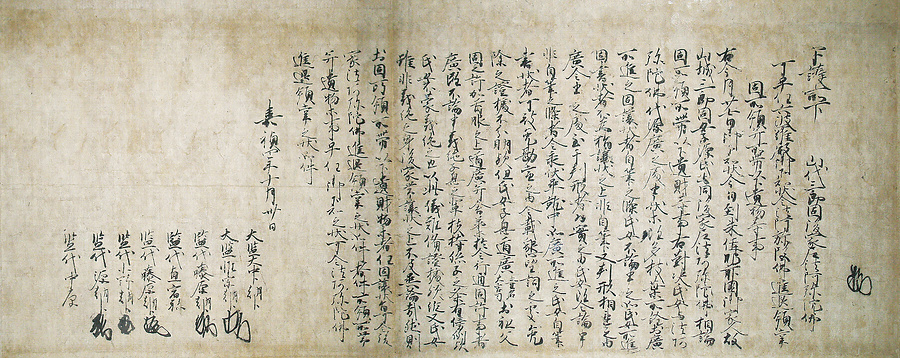 松浦山代家文書は建久3年(1192)に山代固が山代浦の地頭職に補任された旨が記されている前右大将家政所下文をはじめ、鎌倉時代初期から南北朝時代末期に至る文書66通が2巻の巻子装に仕立てられている。山代氏が松浦地方における有力な御家人であったことを裏付けるばかりでなく、鎌倉時代における所領相続・押領などに関する相論、蒙古合戦の軍功に関する文書が多いのが特徴。当時の女子相続の具体相を伝える文書や下松浦党一族の一揆契諾状も含まれている。